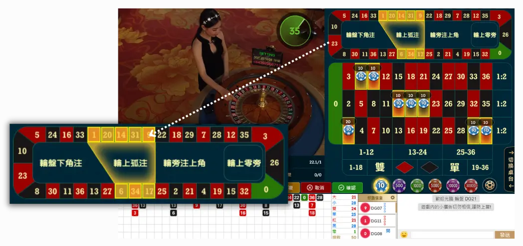 Đặt cược và vui chơi : Theo quy tắc roulette, hãy chọn số hoặc khu vực bạn muốn đặt cược, sau đó đợi người chia bài trực tiếp quay bánh xe roulette và thưởng thức trò chơi!